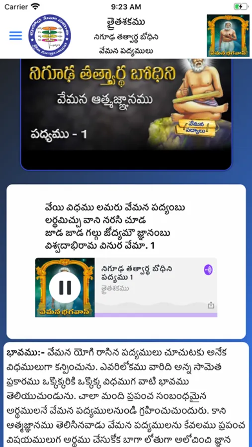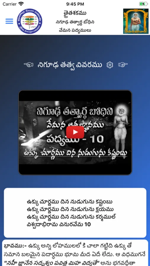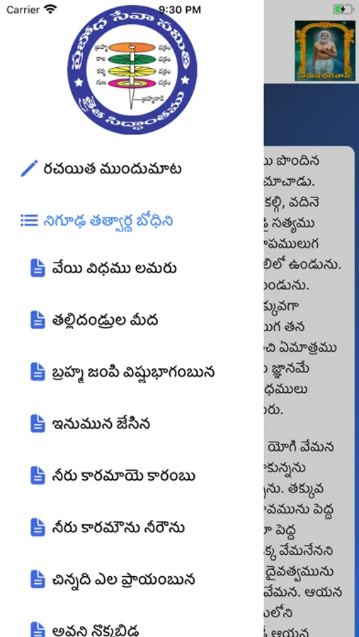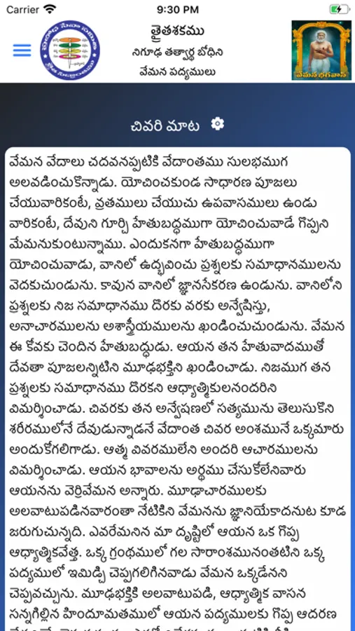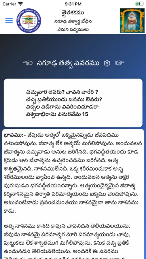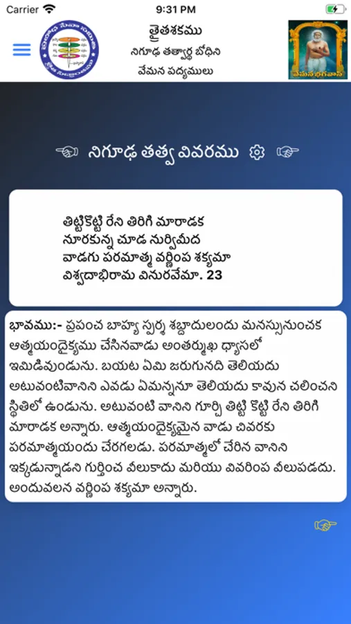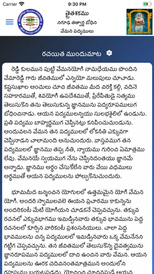 This Application is about Sri Sri Sri Acharya Vemana Yogeeswara Bhagavan. In this app the great interpretation was provided by The only Guru of three religions(Hindu, Muslim, Christian), The Emperor of Spiritual Kingdom, The writer of more than hundred divine holy books, Indu Gnana Dharma Pradata, The Sensational Writer, Adi Karta of Traita Doctrine , Sri Sri Sri Acharya Prabodhananda Yogeeswarulu