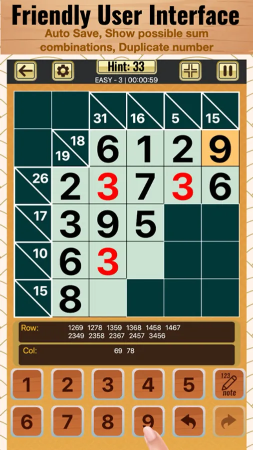 - Autosave, Auto show possible sum combinations, Hint, Undo, Redo available.
