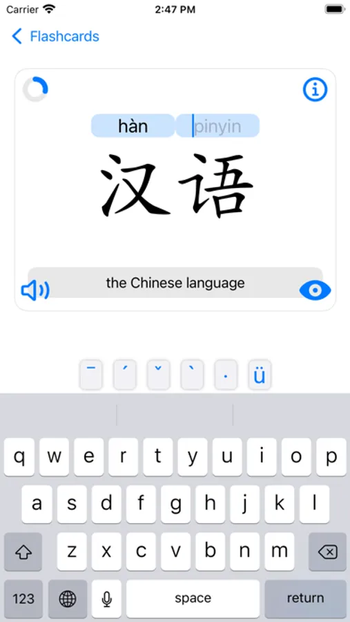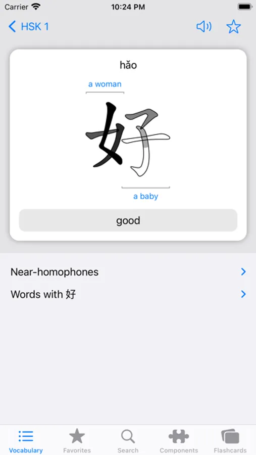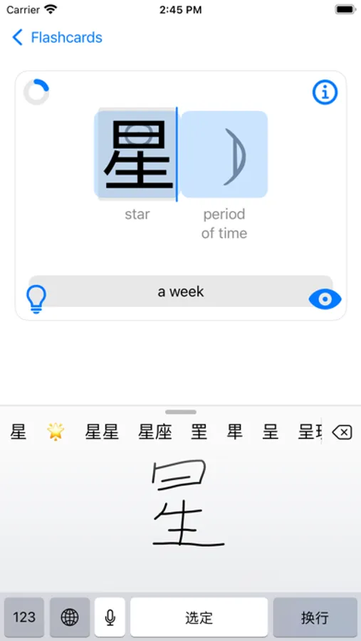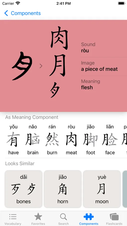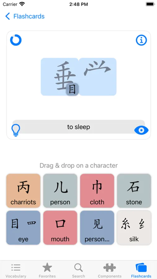 • Test your knowledge of Chinese characters, pinyin, components and word meanings with Flashcards (in-app purchase).