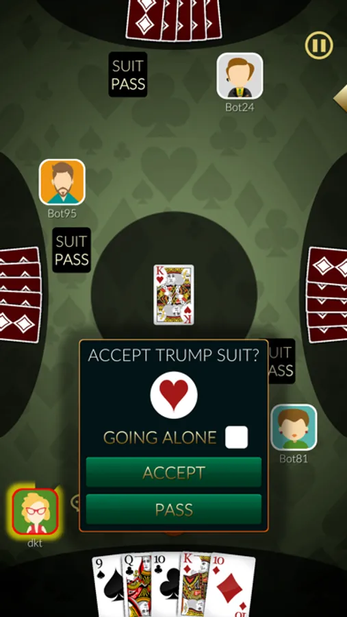 Play Euchre card game where you've to reach 11 points to win.