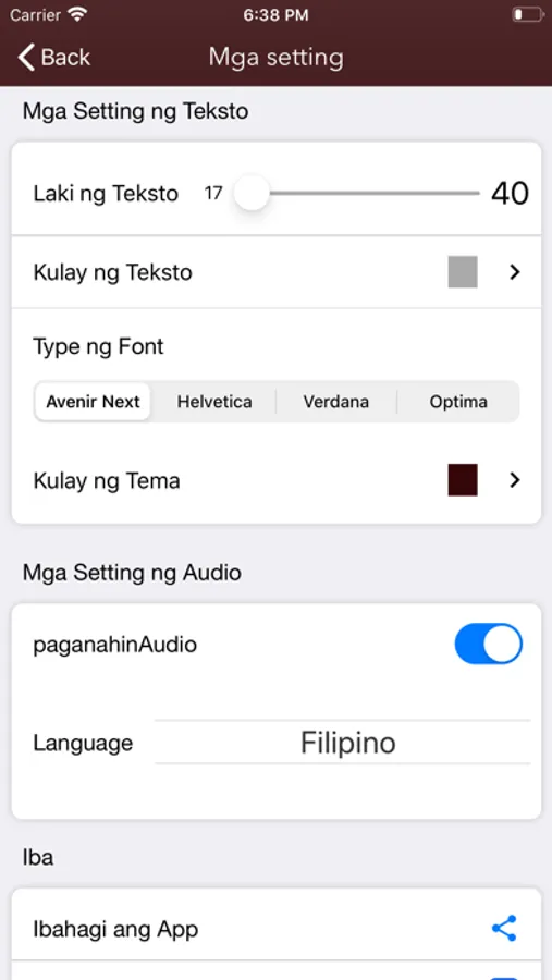 Nag-aalok ang Bibliya ng mga kontrol para sa mas mahusay na pagbabasa tulad ng pag-zoom at pagkakaiba-iba ng kulay para sa mas mahusay na pagbabasa (suriin ang mga tagubilin sa loob ng application)