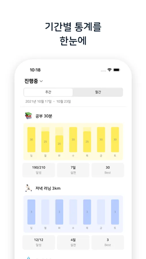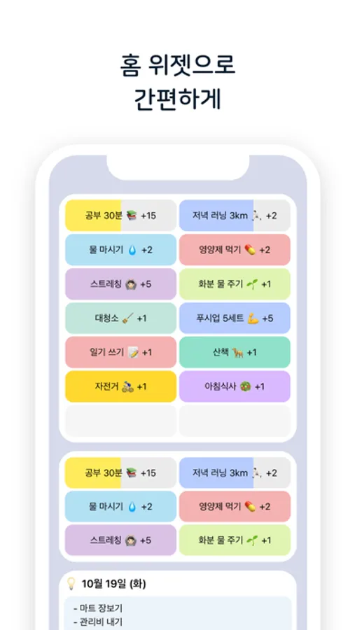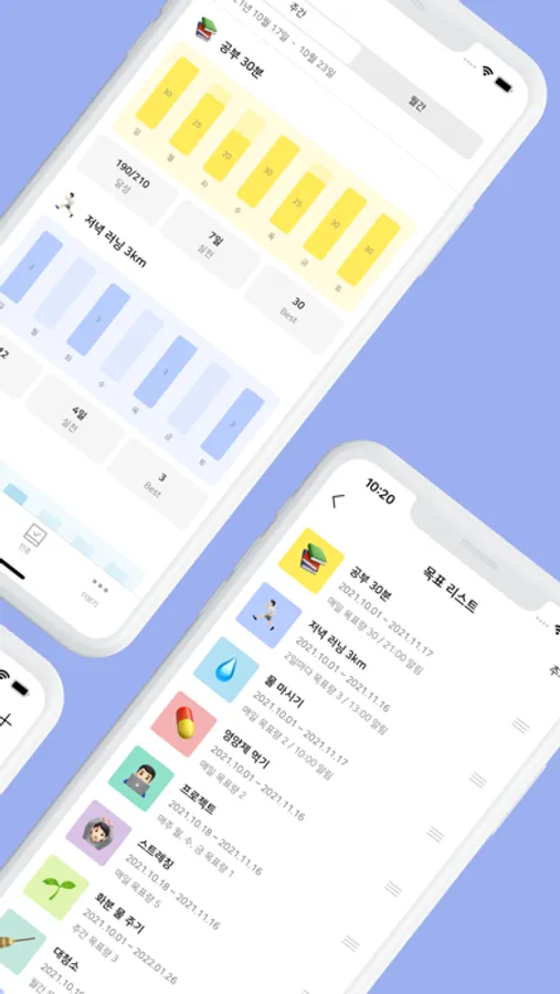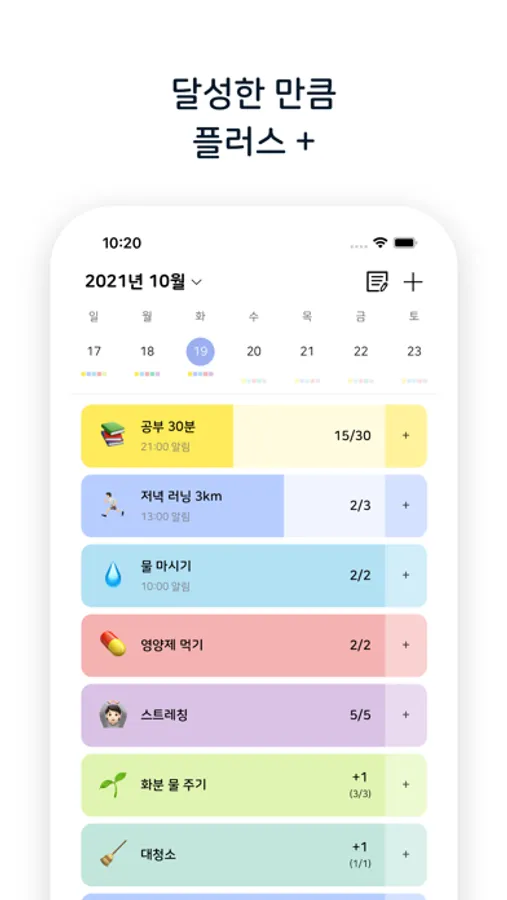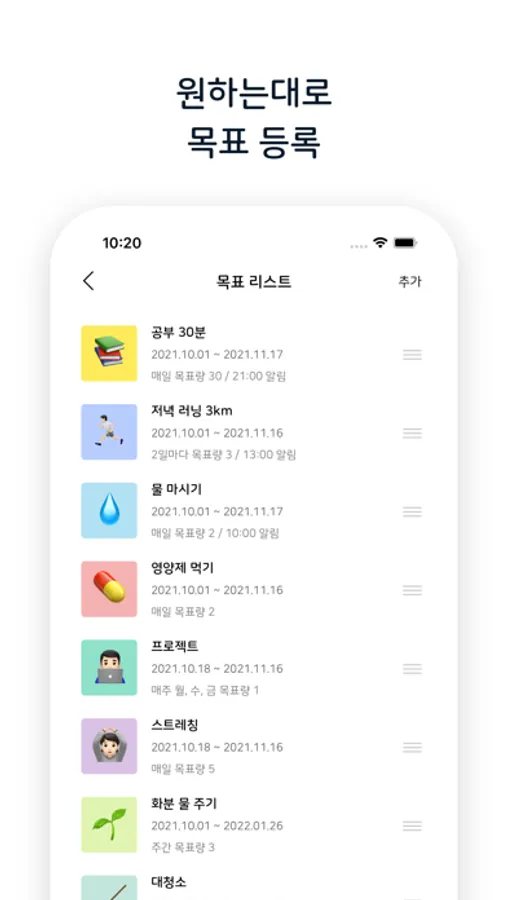 시작부터 크고 거창한 목표를 계획할 필요는 없어요. 자신이 이루고자 하는 목표나 만들고 싶은 습관들을 작게 나누어 등록하고 하루하루 실천해보세요. 시간이 지난 후 작은 목표들이 모여 가져다준 큰 변화를 느낄 수 있을 거예요.