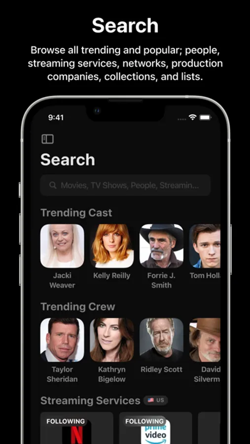 Browse all trending and popular; people, streaming services, networks, production companies, collections, and lists.