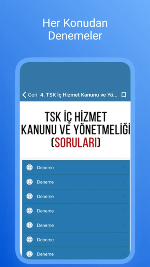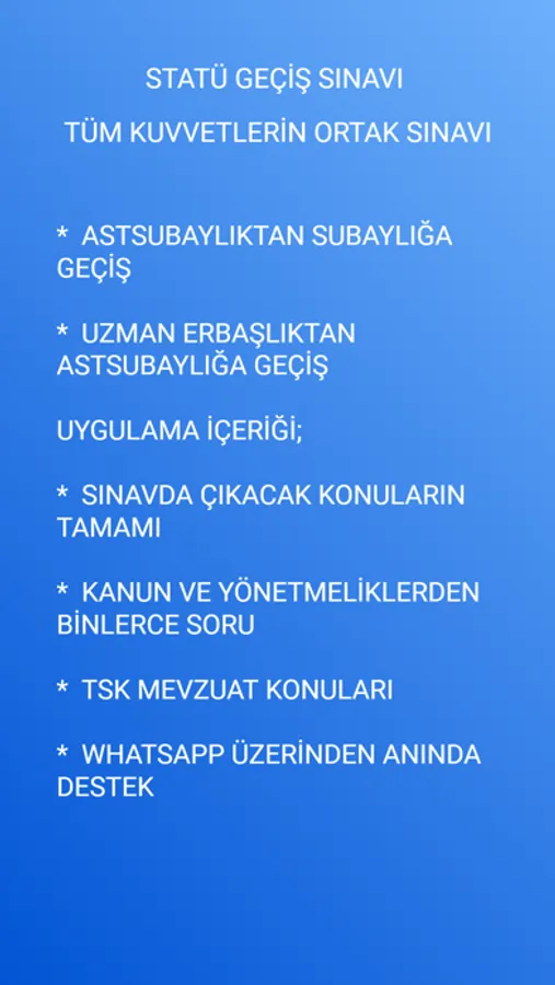 Uygulama; Türk silahlı Kuvvetlerinde görev yapan Subay, Astsubay ve Uzman Erbaşların Statü Geçiş Sınavına hazırlanmalarını sağlar. Uygulama içerisinde Güncel Kanun ve Yönetmelikler bulunmaktadır ayrıca her kanun ve yönetmelikten hazırlanmış sınav formatıyla uyumlu denemeler bulunmaktadır. Sistem üzerinden anında iletişim kurabilir merak ettiğiniz konular hakkında bilgi alabilirsiniz.