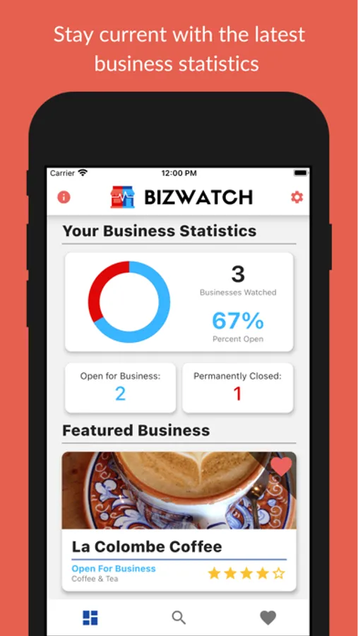 Stay up to date with the latest analysis of the businesses that you are tracking. Stay informed, with confidence, in viewing real-time data that matters to you. BIZWATCH helps you find more businesses that need your patronage by featuring other locations based on your previous searches and preferences, empowering you to continue to support your community!