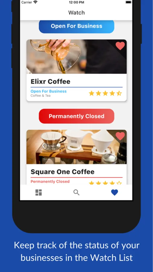 Favorite a business to have BIZWATCH monitor it for status updates on a regular basis, such as whether it is currently open or has permanently closed. See a running list of all of your businesses to keep up-to-date on what is happening in the communities around you. If a business does close, BIZWATCH will update the business’ listing in your Watch List and immediately inform you of the status change. Order your favorites by dragging and dropping a business within each list!