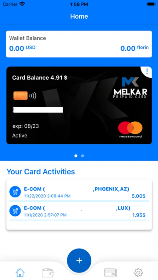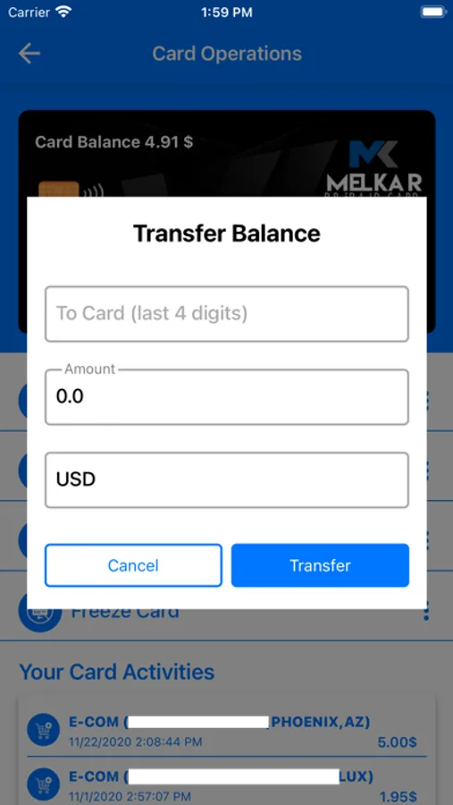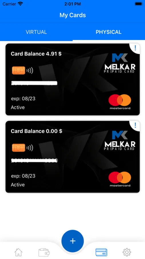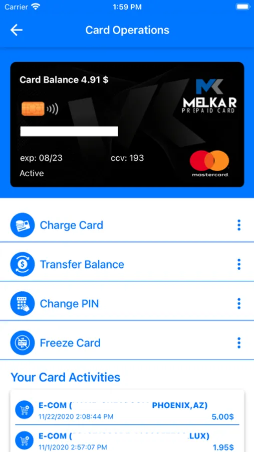 View activities including card balance, card status, expiration date, and transactions for all your active Melkar cards.