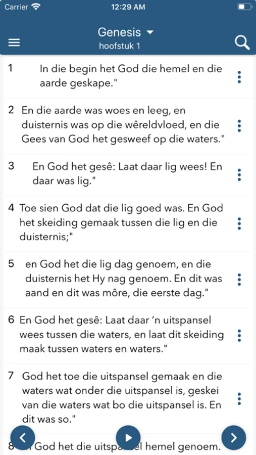 Die Bybel bied bedieningselemente vir fyner leeswerk, soos zoom en kleurkontras vir beter leeswerk (kyk in-app-instruksies)