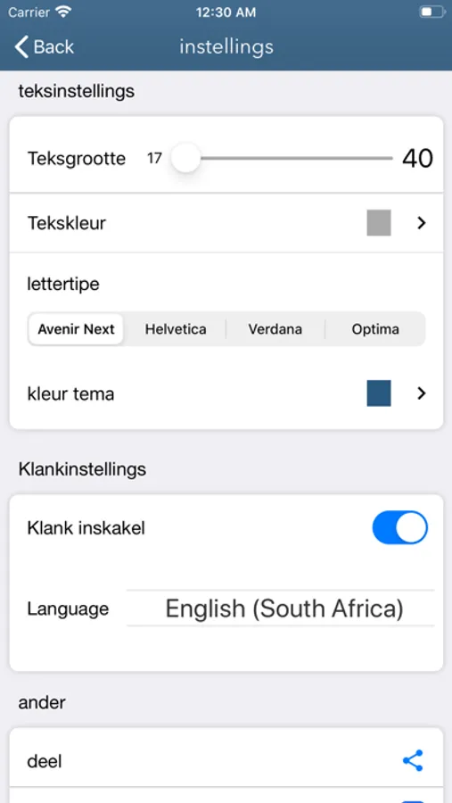 Sluit lettergrootte-instellings in, plus klank vir alle hoofstukke in die Bybel (