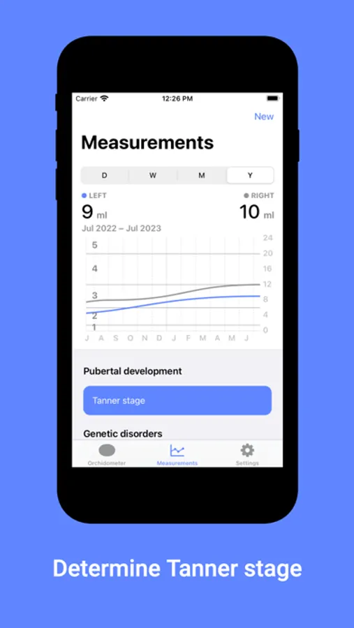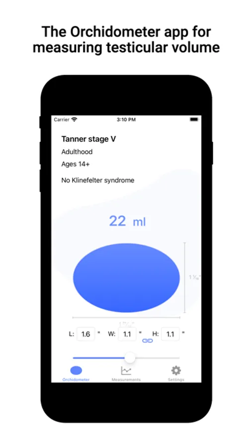 Measure testicular volume with the Orchidometer for iPhone. The orchidometer is highly customizable and automatically adjusts itself to your screen size. It can be used to estimate Tanner stage, age and pubertal development.