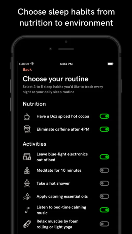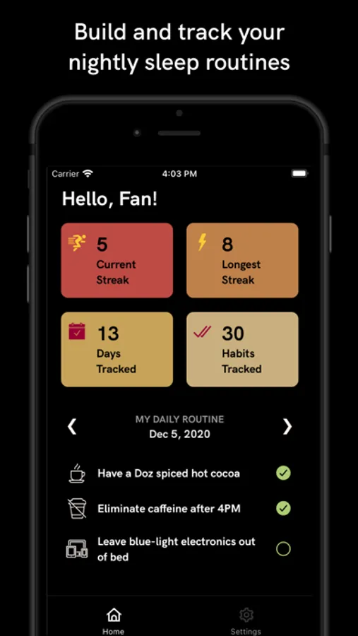 Night Ritual is an app created by sleep nerds to help you build and track healthy sleep habits. Choose from over a dozen habits including nutrition, mindfulness, and the environment. Every night, check off the habits you successfully completed. See your current and longest streaks - and try beating them for a better night's sleep.
