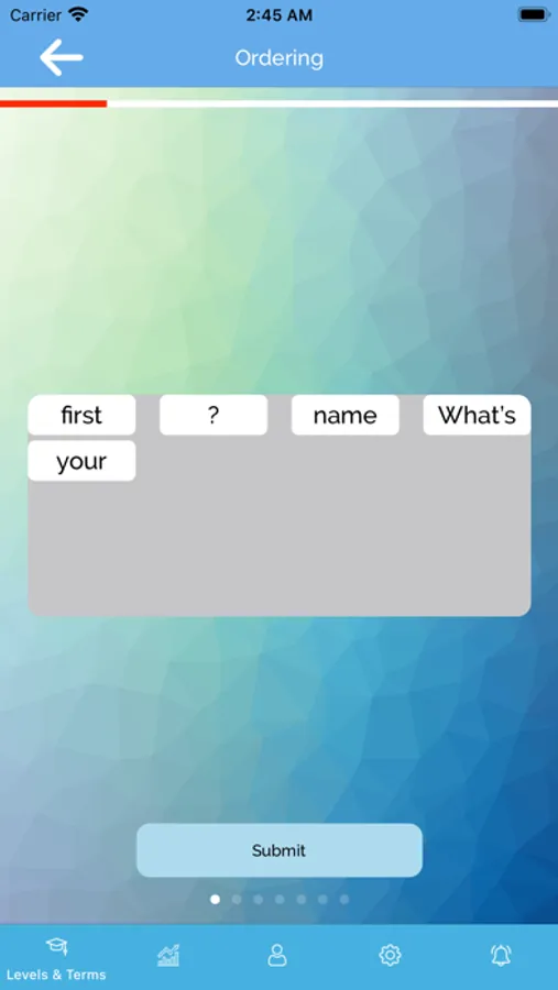 When the app is installed, the user is asked for a cellphone number for verification, then a verification code is sent to the given number, and then a short description of the Training System of the app is presented. Then the user can take a placement test to choose the right level or skip and start with the first term.