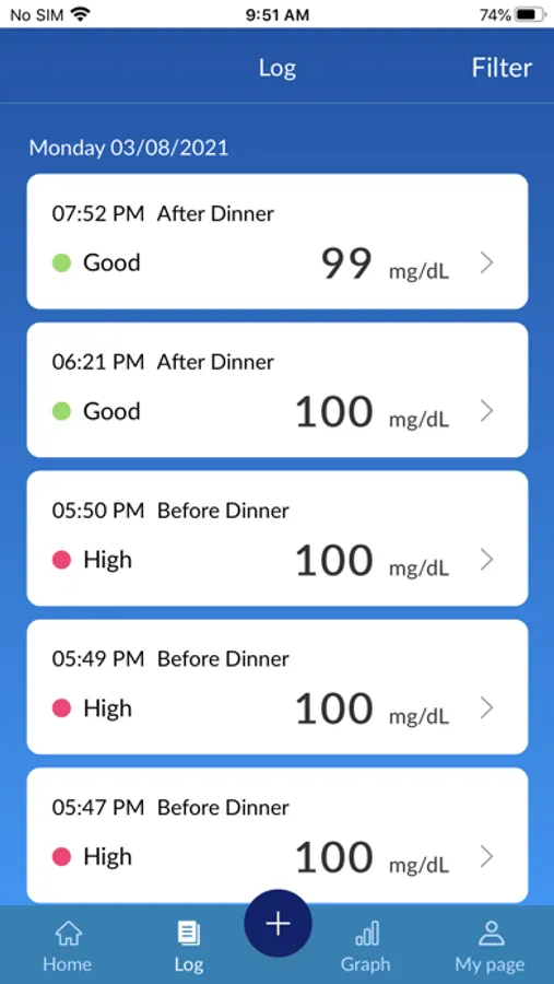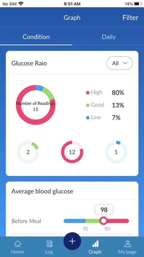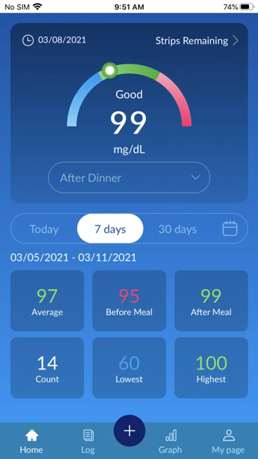 - 7-Day, 30-Day, 3 Month or Custom of blood sugar Log
