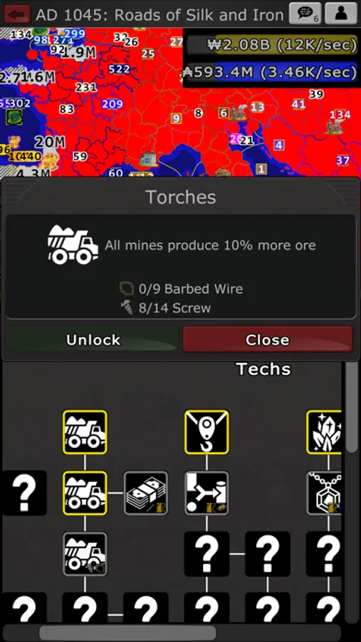 • Auto-advancements help you out by playing the game for you. For example, auto-conquer automatically conquers territories on the map, auto-sell automatically sells resources you don't need, auto-draft automatically picks up drafts, etc. Getting all of them can completely automate the game.