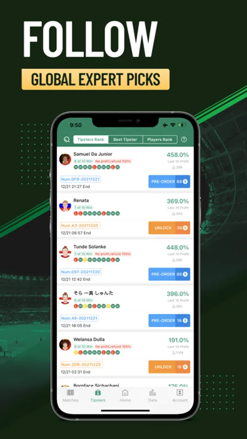 • We currently have more than 4,000 global professional football tipsters,they have strong insight and predictive ability for the leagues and soccer teams they are interested in.TOP10-Tipsters have an accuracy rate of more than 92%, follow them to get more tips and benefits.