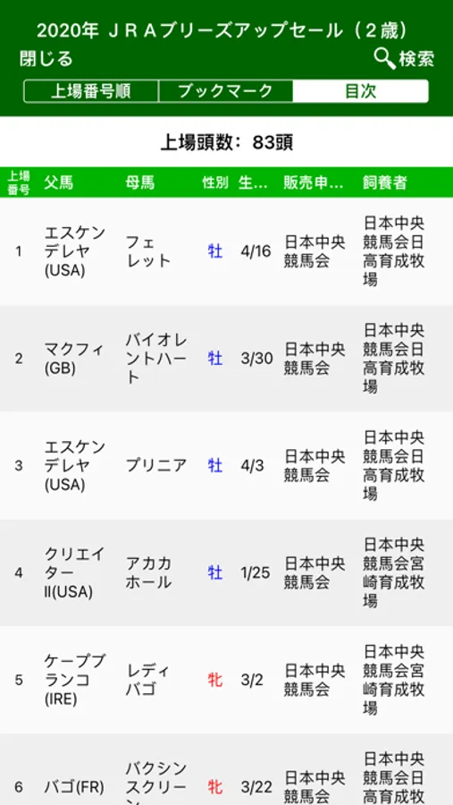 父馬名や母の父馬名、誕生月などの様々な検索条件で、目的の上場馬を簡単に探せます。