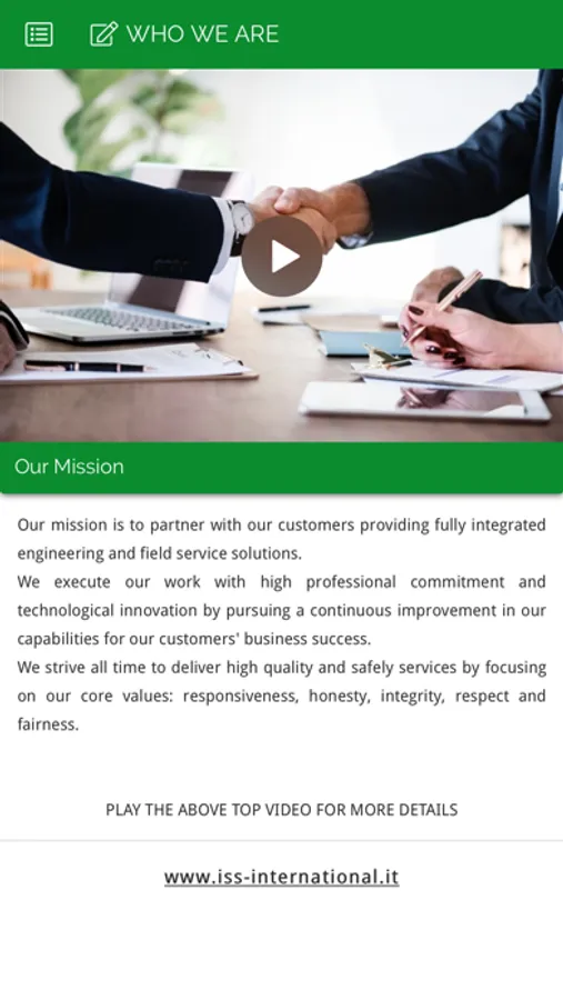THE ISS INTERNATIONAL SPA APP REPRESENT ALL YOU SHOULD KNOW ABOUT ISS INTERNATIONAL SPA AND GIVES YOU A DEAP KNOWLEDGE OF ISS INTERNATIONAL PRODUCTS, SERVICES, GOVERNANCE AND CERTIFICATIONS. IT INCLUDES VIDEOS AND PDF FILE DOWNLOADABLE.