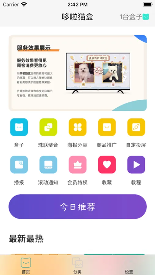 哆啦猫盒,宠物店背后的海报设计师。活动节日不再愁,只需选择喜欢的模板,修改文字,就可以投放在电视跟朋友圈,提升顾客进店率