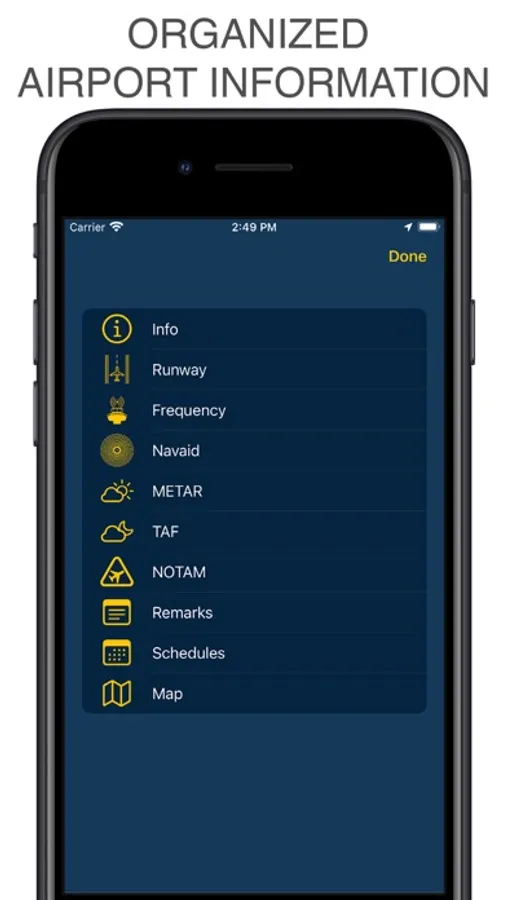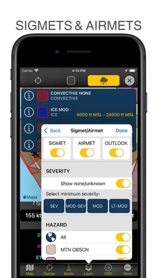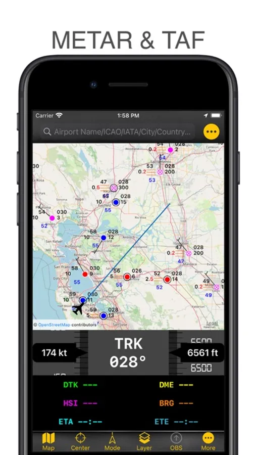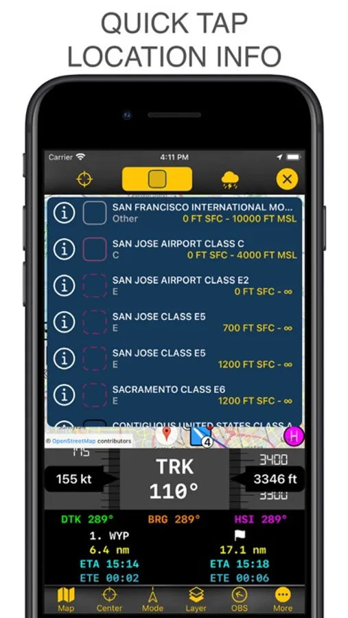 Tap on an airport, navaid, or any location and receive airspace information, frequencies, SIGMETs, AIRMETs, and runway data.