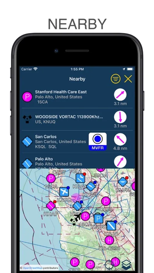 You can check the nearest airports' list, their distance, and relative direction at any time. Select airports from the database to immediately modify your route.