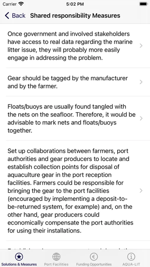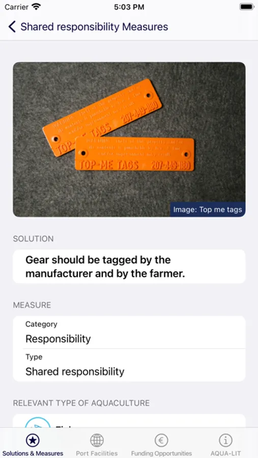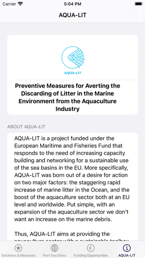 The AQUA-LIT app is a toolbox of solutions, measures and ideas to tackle marine litter at sea. It also has information on which ports in Europe have facilities for receiving waste, and the different types of funding opportunities to implement marine litter management projects at different levels. Do you have an innovative solution that would like to include here? We also have the link for you to contribute to this toolbox that was built by aquaculture stakeholders from across Europe, and the links to the full version of the toolbox which includes furthermore action plans for outermost regions, policy recommendations to help the marine litter problem in the EU sea basins, and a highly-visual marine litter inventory to help you identify the marine litter coming from aquaculture activities. The AQUA-LIT app is product of the AQUA-LIT project, an EMFF co-funded project.