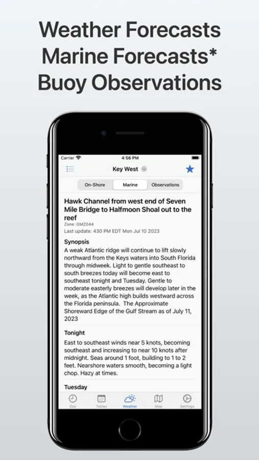 NOAA Marine Forecasts for most locations, including warnings, synopses, waves and wind conditions for most locations. NOAA NDBC buoy weather observations for many locations. NWS detailed on-shore weather with detailed daily forecasts. (*Premium required for marine forecasts; some locations that are very remote or far up rivers are not in marine forecast zones.)
