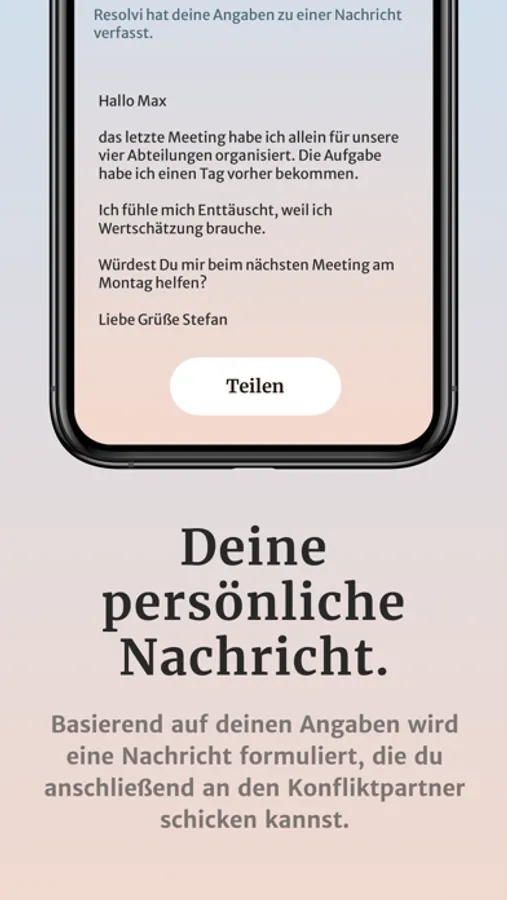 Basierend auf deinen Angaben wird eine Nachricht formuliert, die du anschließend an den Konfliktpartner schicken kannst. Wenn du möchtest, kannst du diese selbstverständlich noch anpassen und deinen persönlichen Touch geben.