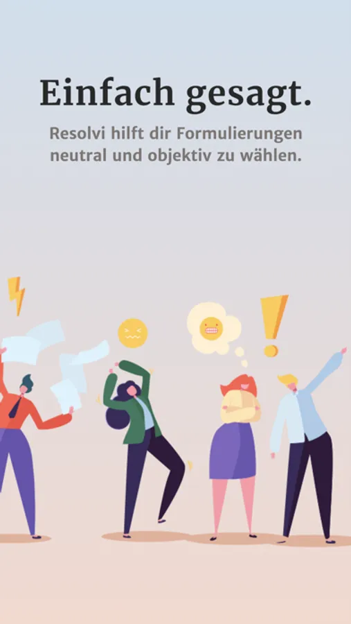Du hast einen Konflikt oder Streit, ärgerst Dich über deinen Kollegen, deinen Partner oder einen Freund? Oft versuchen wir diese Situationen zur ignorieren, werden emotional und machen unserem Ärger lautstark Luft. Nicht der beste Weg zur Lösung – vermutlich wird das eure Beziehung belasten. Sprich den Konflikt auf digitalen Weg an, mit Resolvi als deinen Coach. Er findet mir Dir gemeinsam die richtigen Worte.