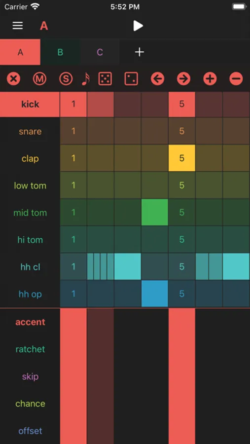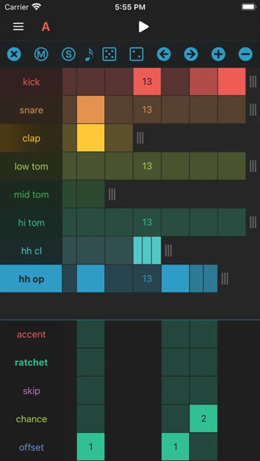 - independently configurable sequence length per drum voice (ranging from 1 to 32 steps)