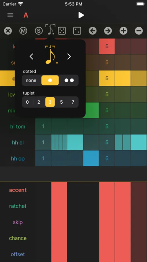- independently configurable step length per drum voice (ranging from double whole notes to 64th notes, including tuplets and dotted notes)