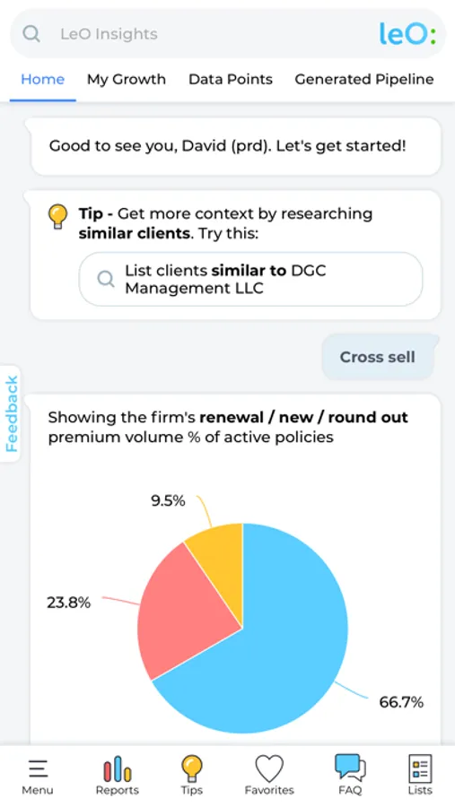 Knowledge is power. LeO Insights turns your data into knowledge. LeO Insights is a conversational AI interface that empowers insurance producers and managers to grow their business: Get meaningful analytics, follow up on actionable insights and see measurable results. Backed by LeO’s AI technology, users get instant access to their book-of business and relevant prospects, allowing them to make informed decisions about their clients, policies, prospects, and carriers; discover hidden trends and outliers and identify key business drivers for cross-selling and client retention. All in natural language, all in the palm of your hand.