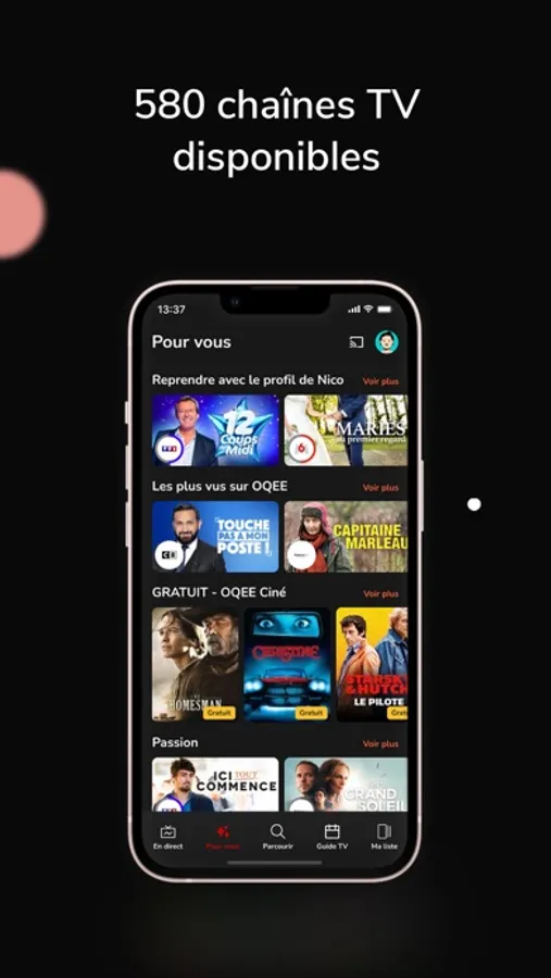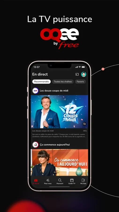Avec l'interface TV OQEE by Free, profitez de plus de 580 chaînes TV en direct et de nombreuses chaînes Replay inclus, ainsi que des fonctions avancées (contrôle du direct, start-over, enregistrement…)