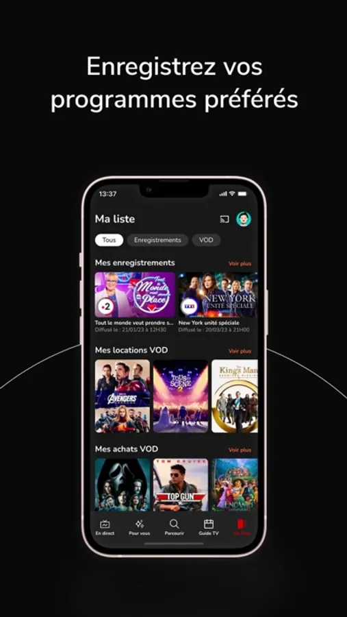 ENREGISTREMENT : Effectuez un enregistrement en direct ou une programmation pour visionner vos programmes à tout moment.
