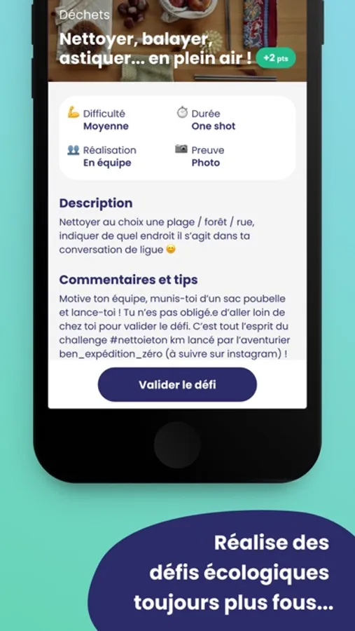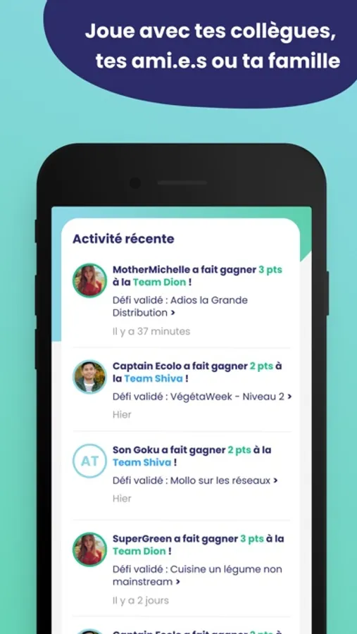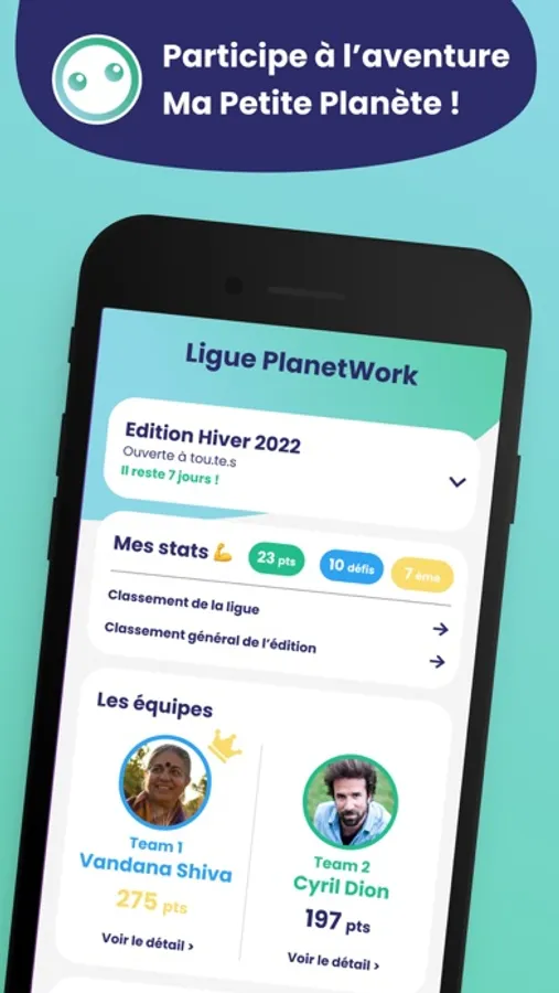 Pendant 3 semaines, tu devras valider un maximum de défis BONUS écolos (mais gare aux MALUS!) afin de faire gagner ton équipe ! (Team Vandana Shiva ou Team Cyril Dion)