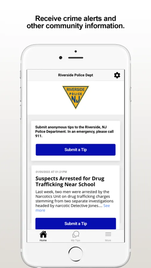 The Riverside PD app provides citizens the ability to submit anonymous tips to the Riverside, NJ Police Department. The app also displays agency crime alerts and other organization web and social media content.