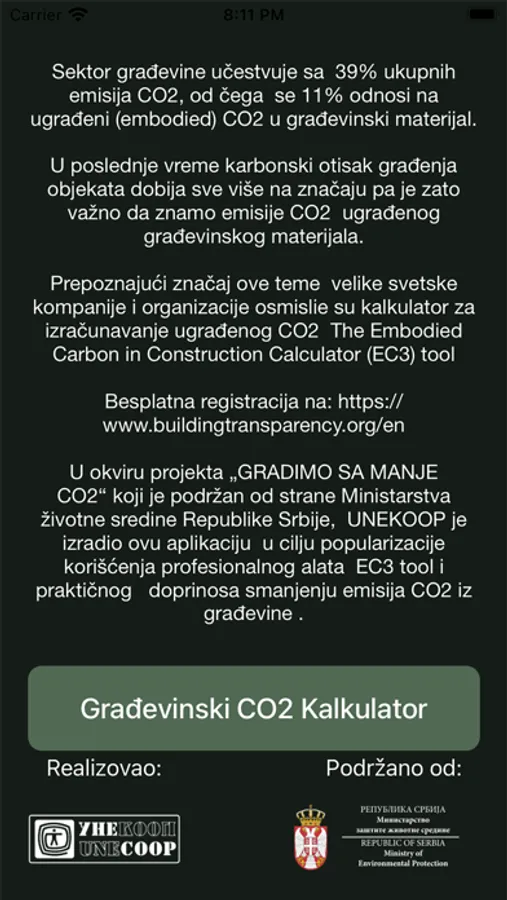 Ova aplikacija nastala je u okviru projekta "GRADIMO SA MANJE CO2" koji se bavi promocijom dekarbonizacije sektora građevine u fazi gradnje. Projekat je podržan od strane Ministarstva za zaštitu životne sredine Republike Srbije.