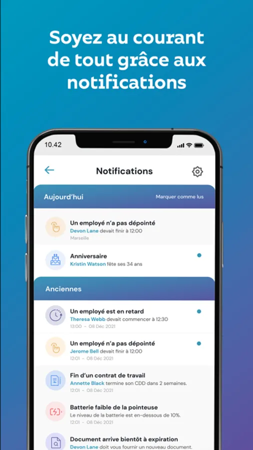 - Recevoir des notifications instantanément à chaque fois qu’un employé ne pointe pas l’arrivée ou le départ sur la pointeuse.