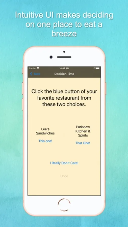 With "I Don’t Care!!", there is now an easy and quick way to decide where you want to eat. Simply pick a type of restaurant to get a list of the nearby locations that fit your choice, then pick between two at a time until you come to the final decision. With special features like being able to call the restaurant, or visit their website from the app, picking a spot for dinner has never been easier. Next time somebody says that they don’t care where they eat, show them "I Don't Care!!"