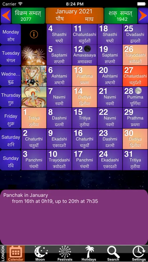 For every year, our panchang contains more than 340 important date of events and holy festivals in India. It reflects India's culture through the Hindu, Muslim, Sikh, Christian and civil festivals happening all along the year. Nearly all the festivals are illustrated with a colorful image.
