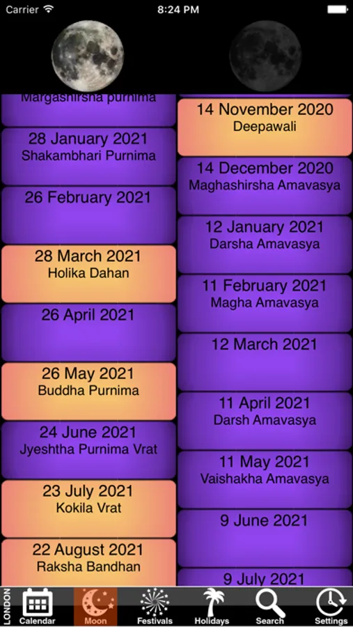- A list of full moon (purnima) and new moon (amavasaya)