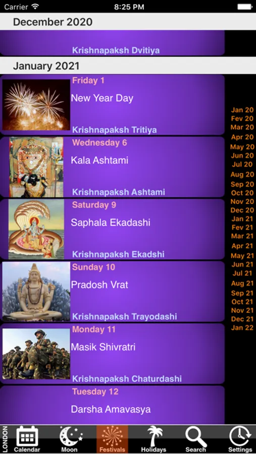 - A list of events and holy festivals, sorted by months, with direct access to any month.