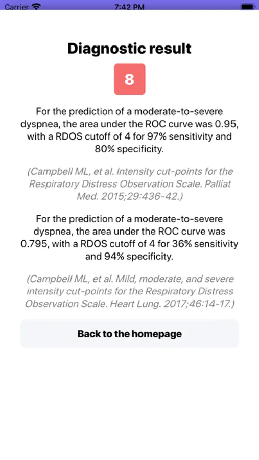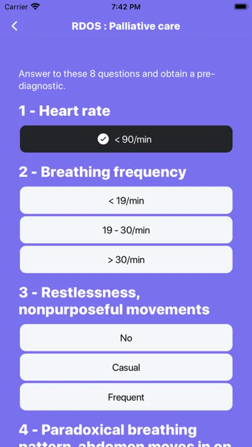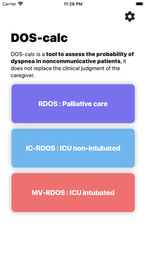 This application was developed for the respiratory and critical care team at the Pitié-Salpétrière hospital in Paris to facilitate the calculation of dyspnea observational scales RDOS, IC-RDOS and MV-RDOS. As dyspnea is by definition subjective, these scales do not claim to affirm the presence or absence of dyspnea but offer the possibility to strongly suspect dyspnea in noncommunicative patients in different clinical contexts.