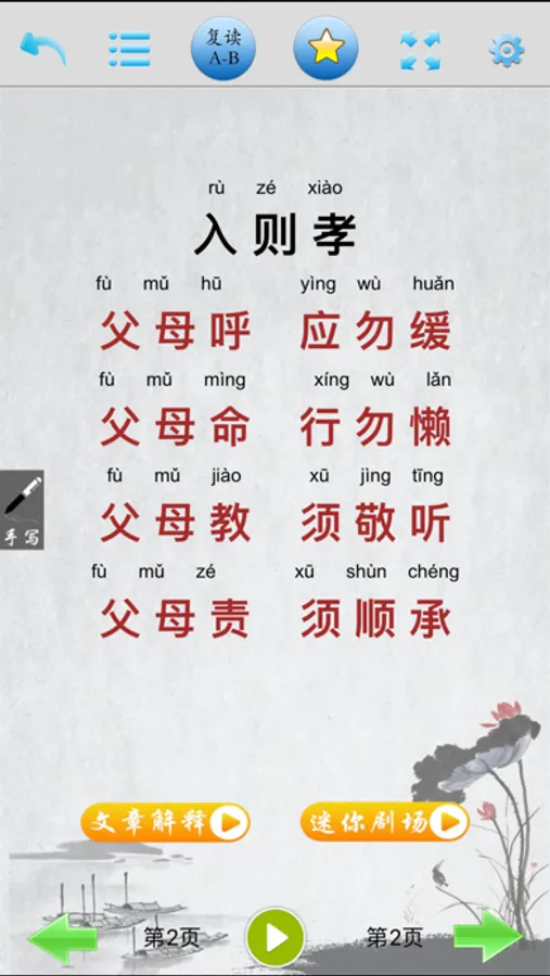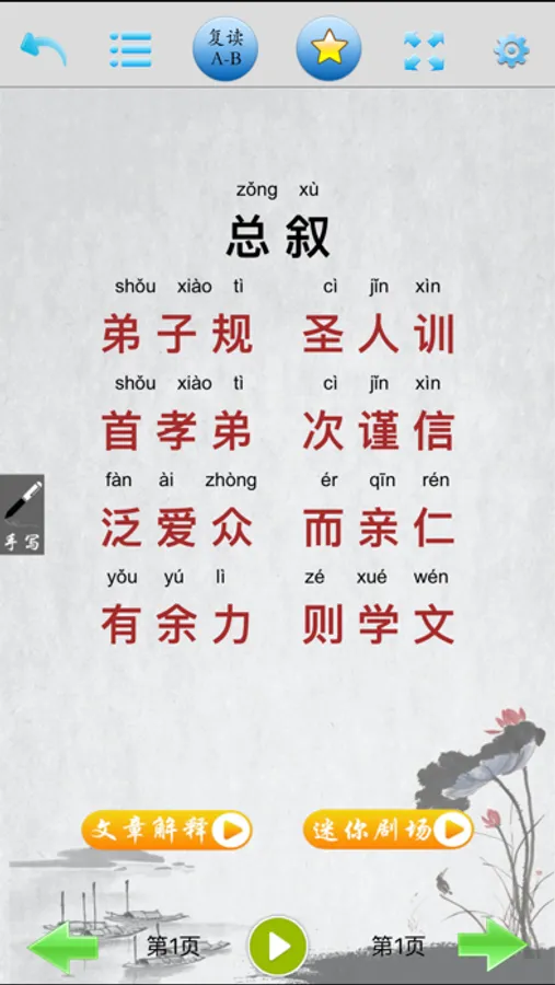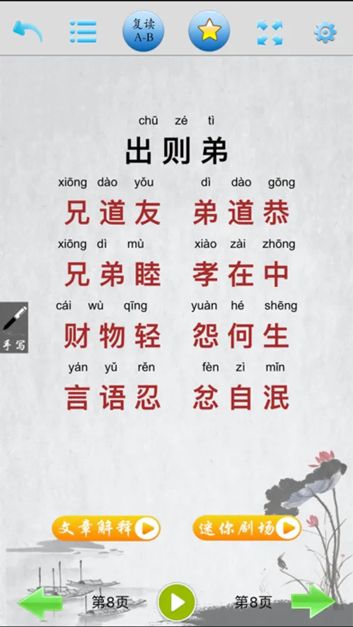 文字都加上了拼音,点击还可以读出语音,低年级的学生可以通过拼音来学习,幼儿可以听语音。