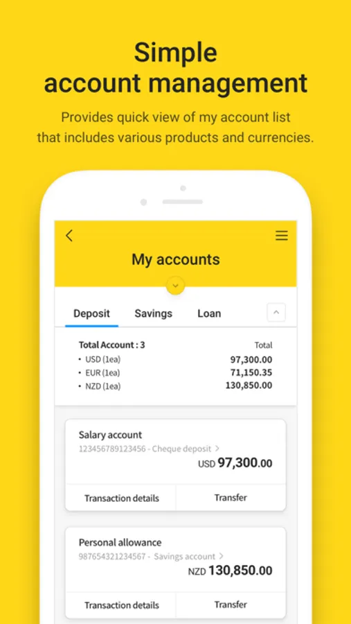 - Accounts : All Accounts Balance Check, Transaction Details, Exchange Rate