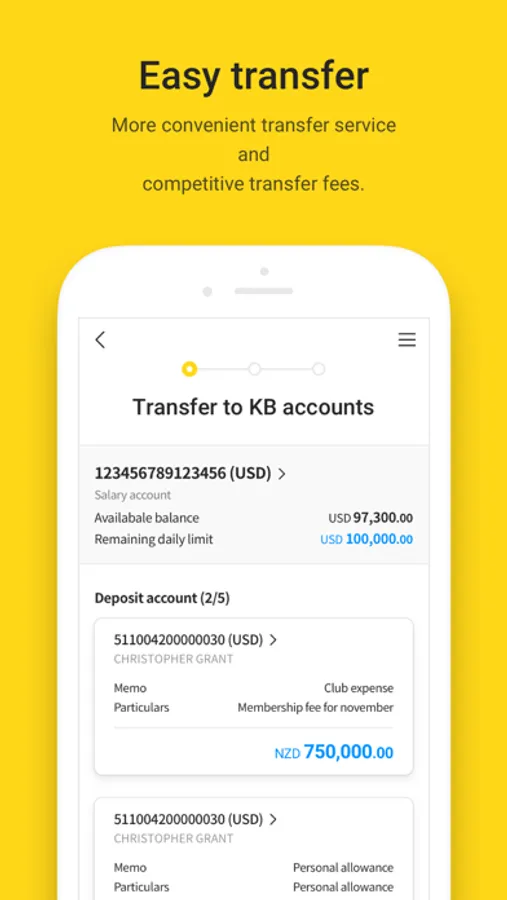 - Transfer : To KB Bank/To Other Banks/Currency Exchange/Overseas Transfer