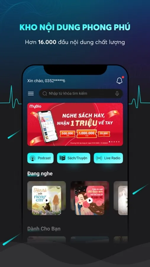 MyDio là một ứng dụng nghe sách nói toàn diện khi có đến hơn 20.000 đầu nội dung audio chất lượng với nhiều thể loại khác nhau, từ sách kỹ năng, kinh doanh, truyện ngôn tình, trinh thám, blog radio, tin tức, âm nhạc, tiếp sóng VOV... và rất nhiều nội dung đặc sắc khác.
