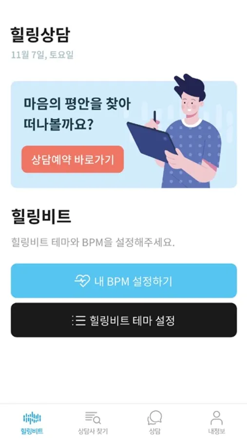 힐링비트를 통해 내 BPM에 맞는 진짜 힐링음악을 들으며, 전문 심리상담사와 함께하는 힐링토크를 할 수 있는 어플리케이션입니다.