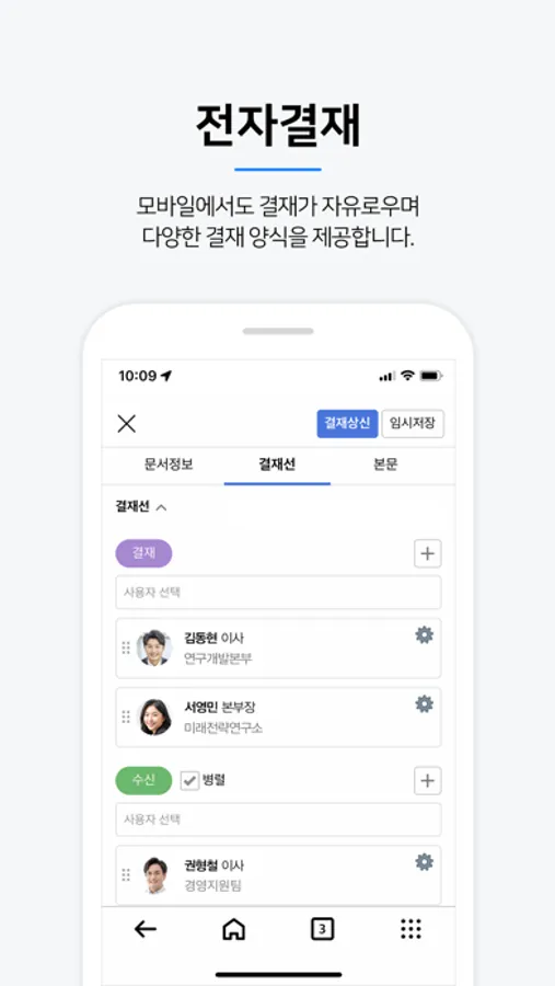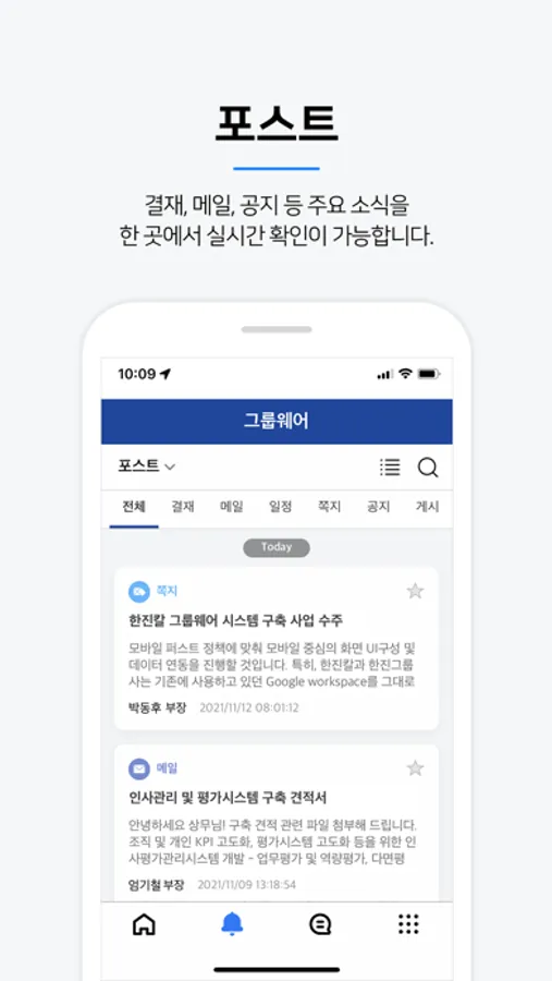 - 사진이나 문서를 그룹웨어에 공유하거나, 첨부할 수 있으며 QR 인식기를 내장하고 있습니다. 또한, 푸쉬 알림 기능을 통해 결재 알림 등 업무와 관련된 각종 알림 메시지를 받아볼 수 있습니다.