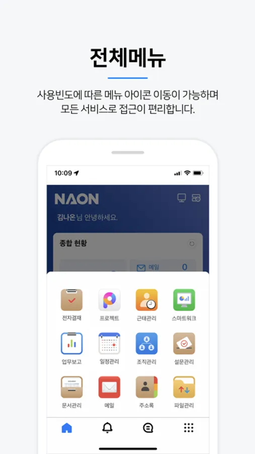 - 메일, 전자결재, 일정 관리, 게시판, 임직원 주소록 등 나온그룹웨어에서 제공하는 주요 서비스를 모바일 환경에서도 자유롭게 사용하여 시간과 장소의 제약 없이 업무를 확인하고 처리할 수 있습니다.