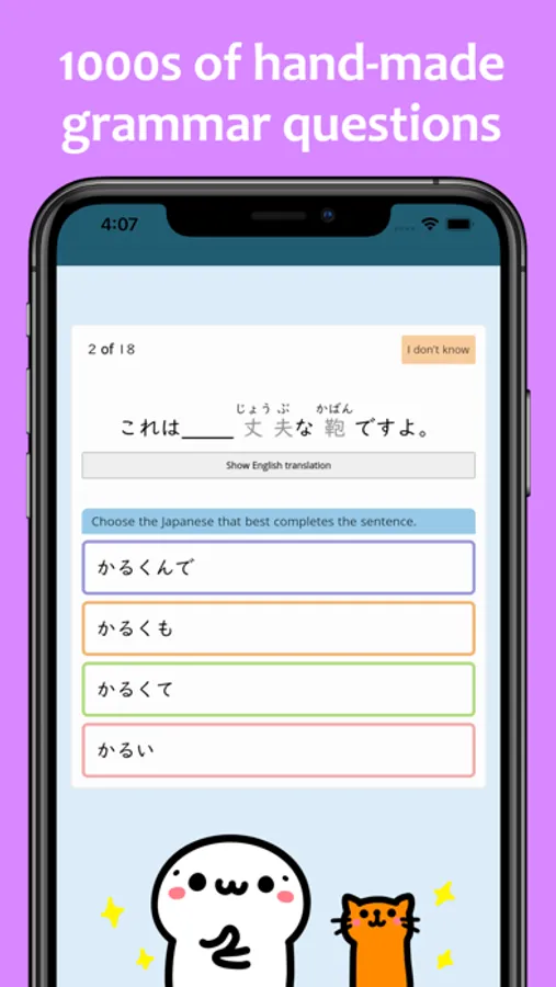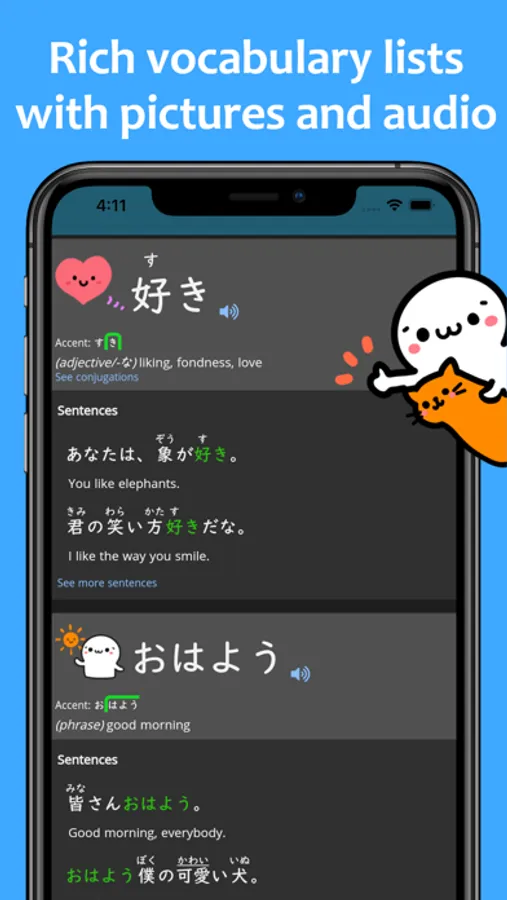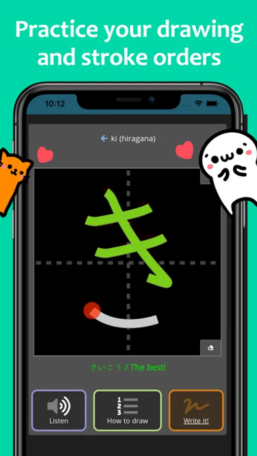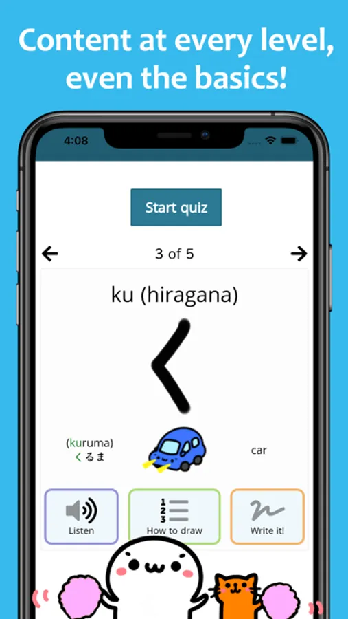 Our mascot Kao-chan is here to let you enjoy learning Japanese, whether it’s through collectible coins every time you quiz, a character that evolves as you learn, manga pages that you unlock, or hundreds of hand-made illustrations.